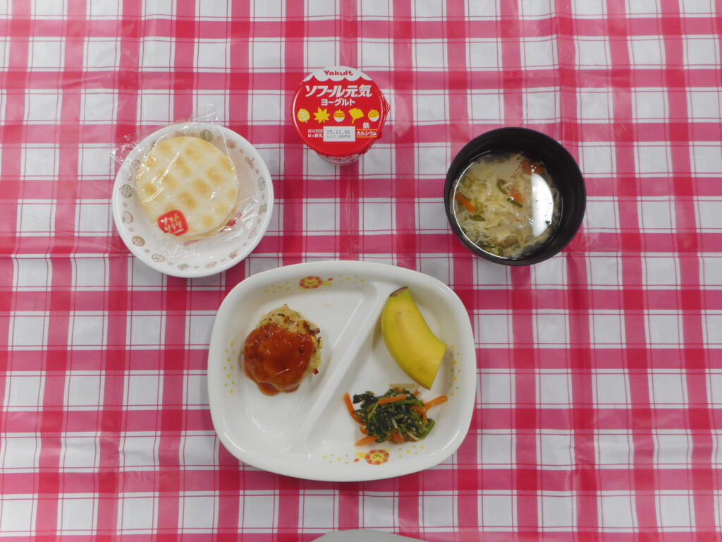 【給食】 もぐもぐバーグ ほうれん草のごま和え かに玉スープ ...