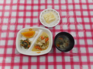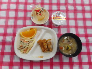 【給食】 鯖の竜田揚げ マカロニサラダ 豚汁 オレンジ 【おやつ】 ヨーグルト ...