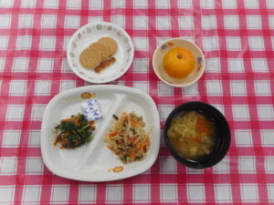 【給食】 五目ビーフン 小魚和え かきたまスープ チーズ 【おやつ】 みかん ...