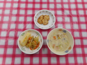 【給食】 里芋のみそシチュー 大根サラダ ふりかけ りんご 【おやつ】 ロシアンクッ ...
