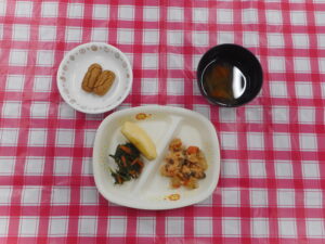 【給食】 くわ焼き ほうれん草のいそべ和え すまし汁 りんご 【おやつ】 きなこちん ...