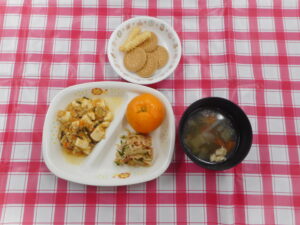 【給食】 マーボー豆腐 切り干し大根ナムル チンゲン菜スープ みかん 【おやつ】 ビ ...
